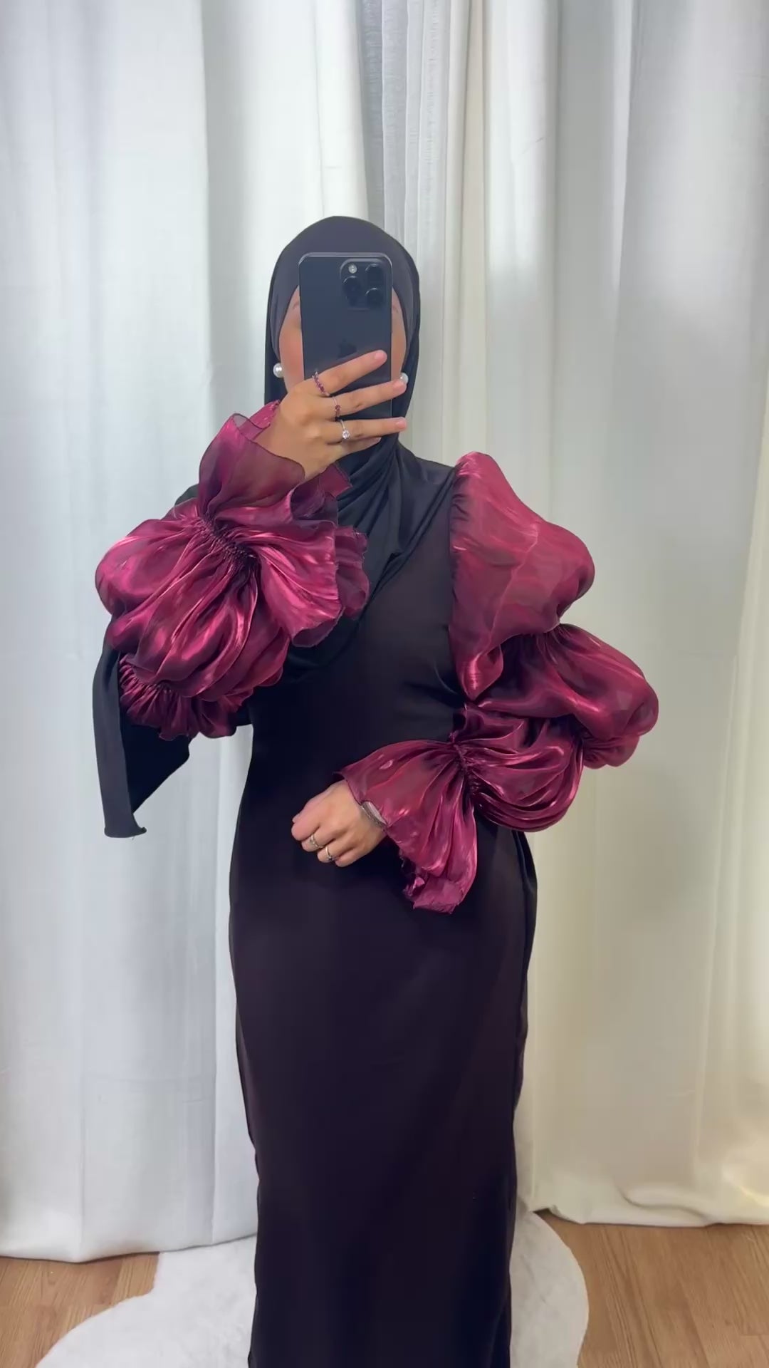 Les manches en organza brocart ajoutent une touche de luxe et d'originalité à cette pièce unique. Légères et aériennes, elles contrastent délicatement avec le tissu fluide de la robe, créant un jeu de textures subtil et élégant. Le design cache-cœur assure un ajustement parfait grâce à sa coupe soigneusement étudiée.
