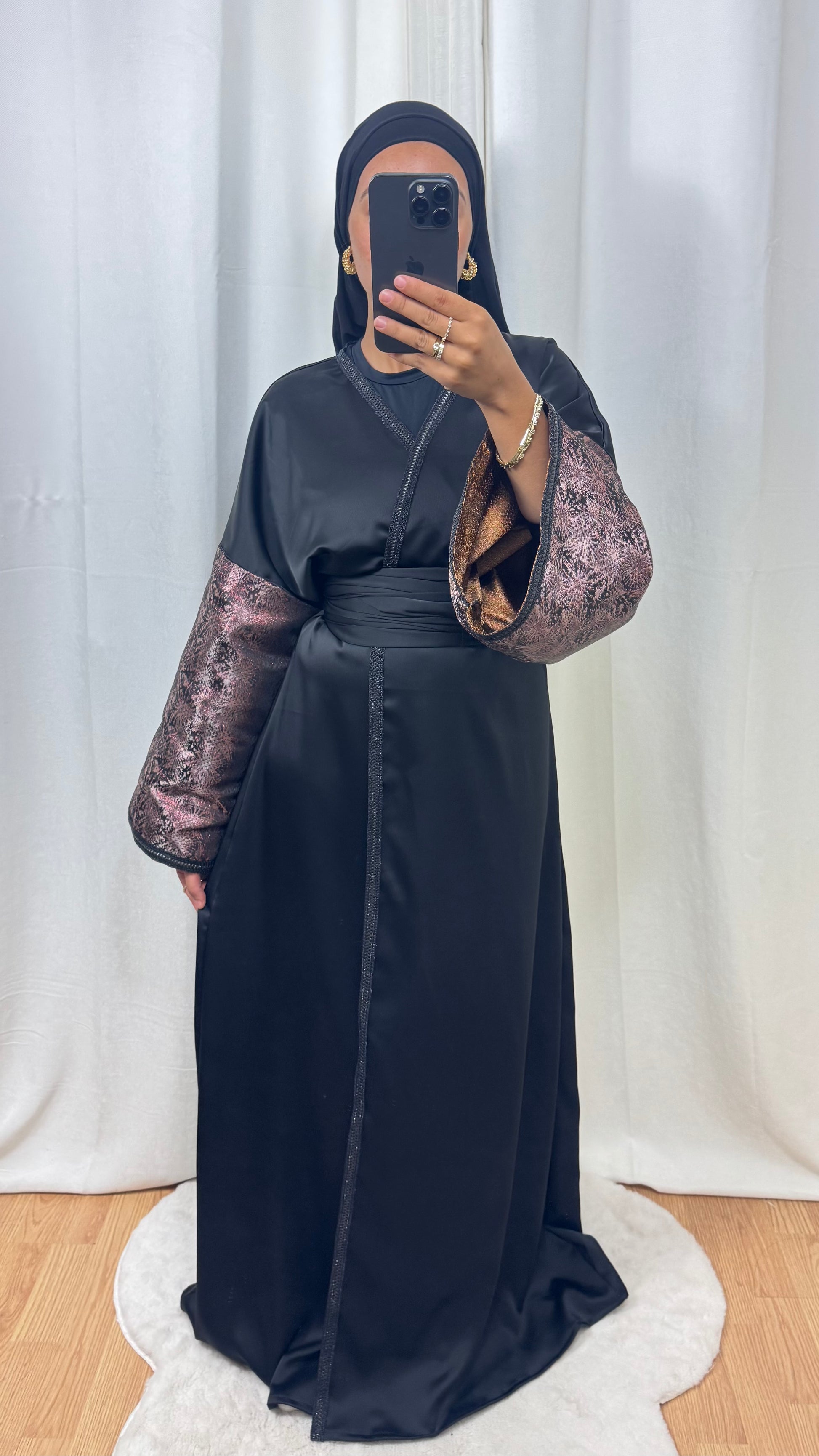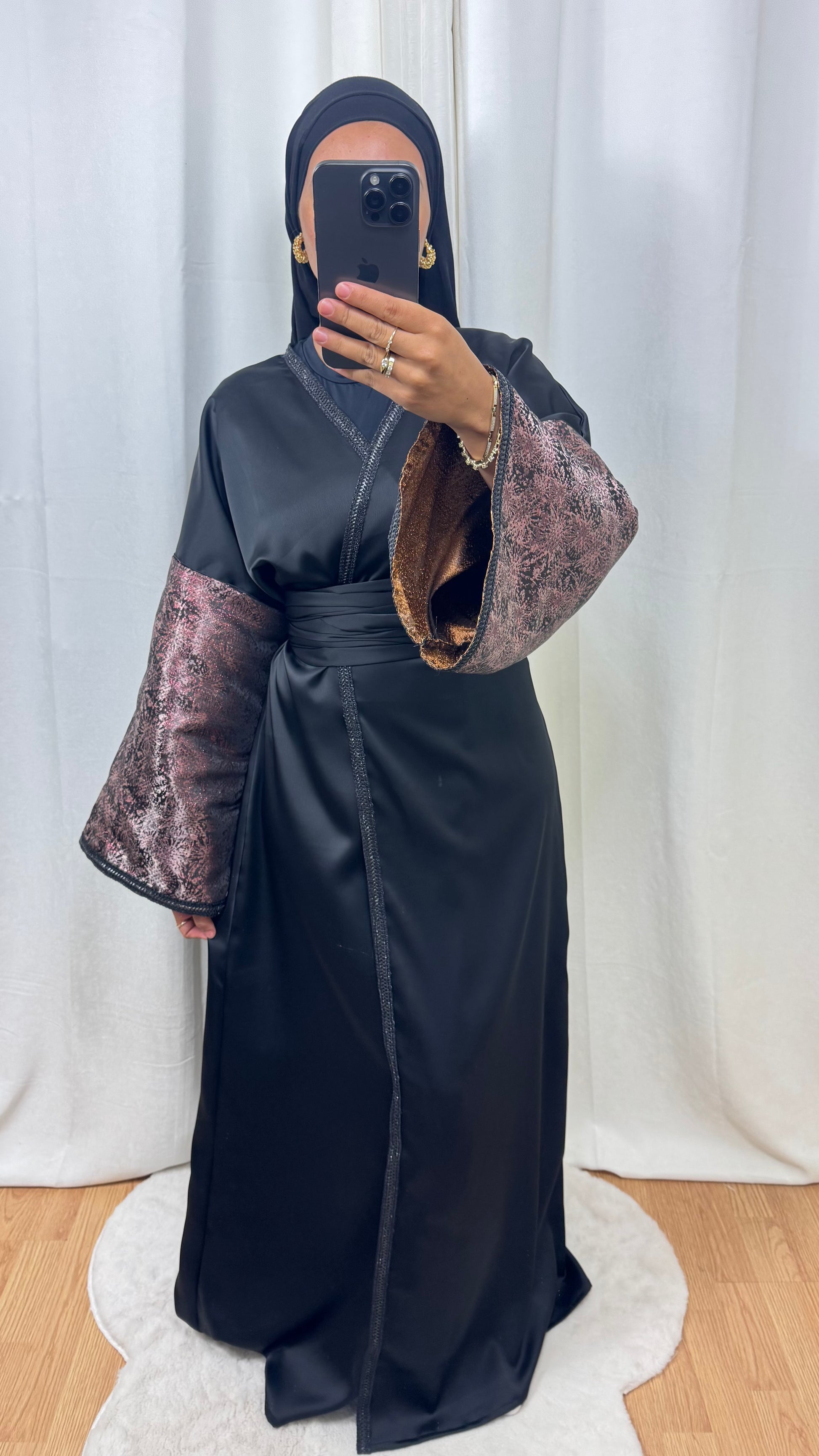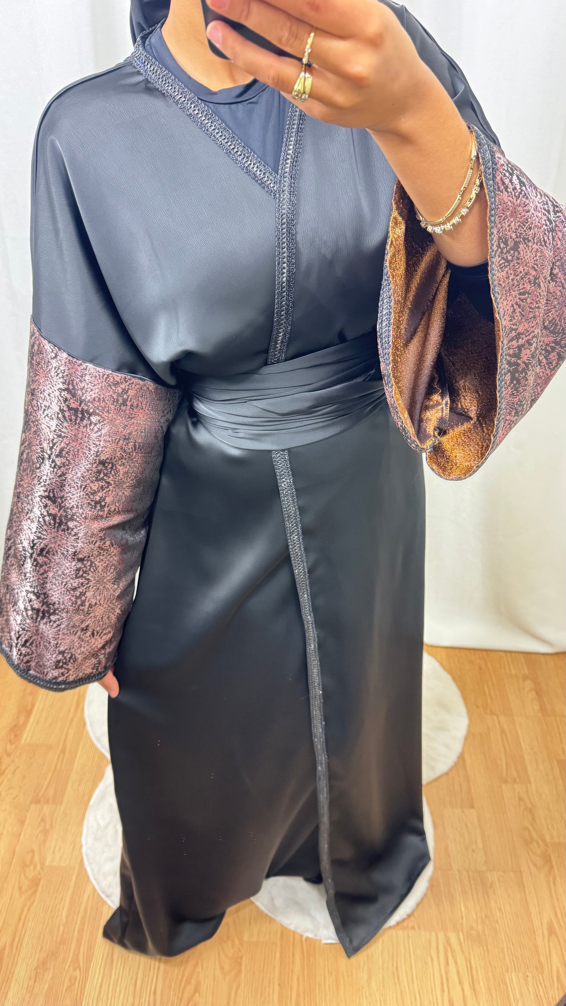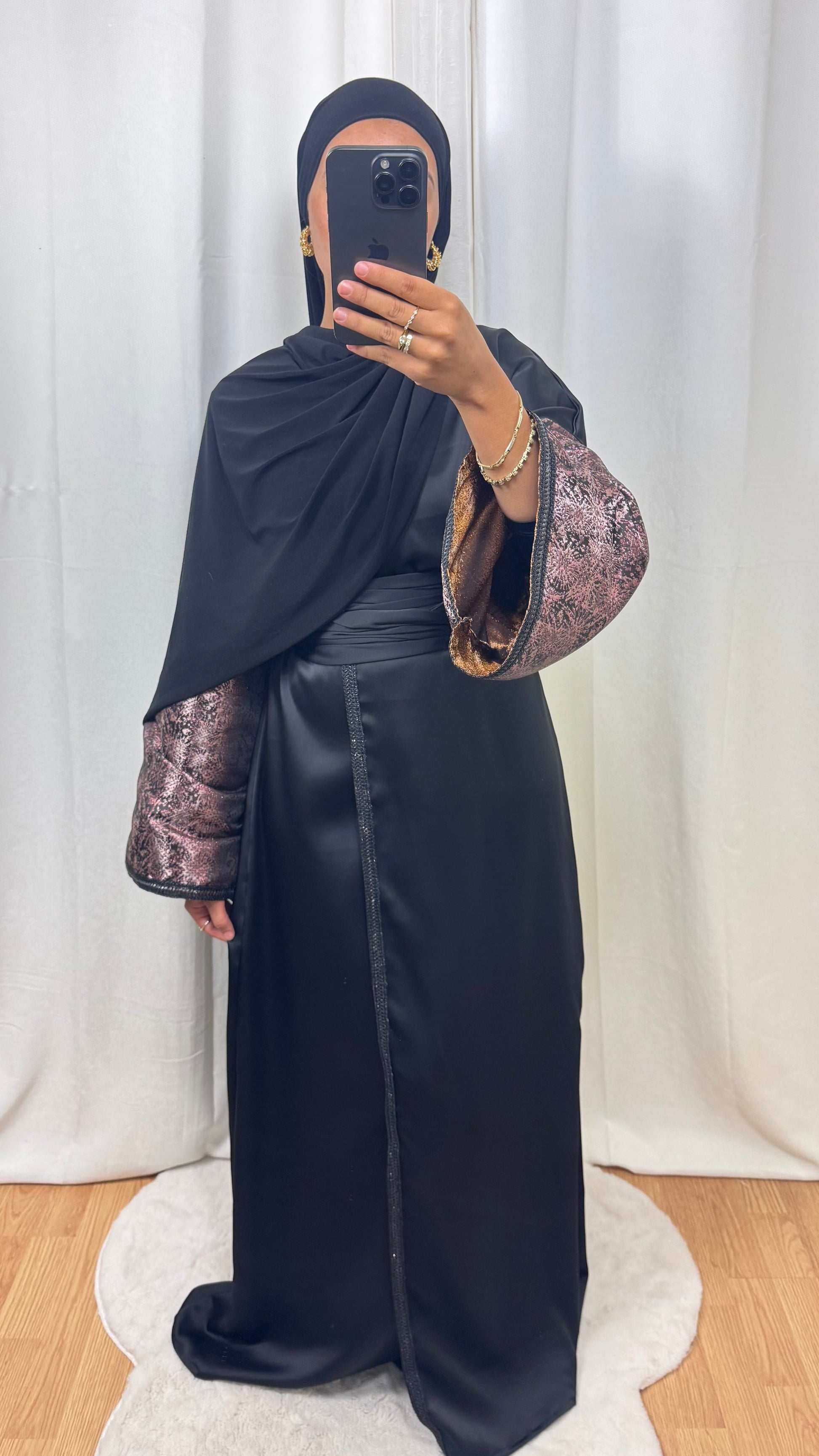Les manches en brocart ajoutent une touche de luxe et d'originalité à cette pièce unique. Légères et aériennes, elles contrastent délicatement avec le tissu fluide de la robe, créant un jeu de textures subtil et élégant. Le design cache-cœur assure un ajustement parfait grâce à sa coupe soigneusement étudiée.