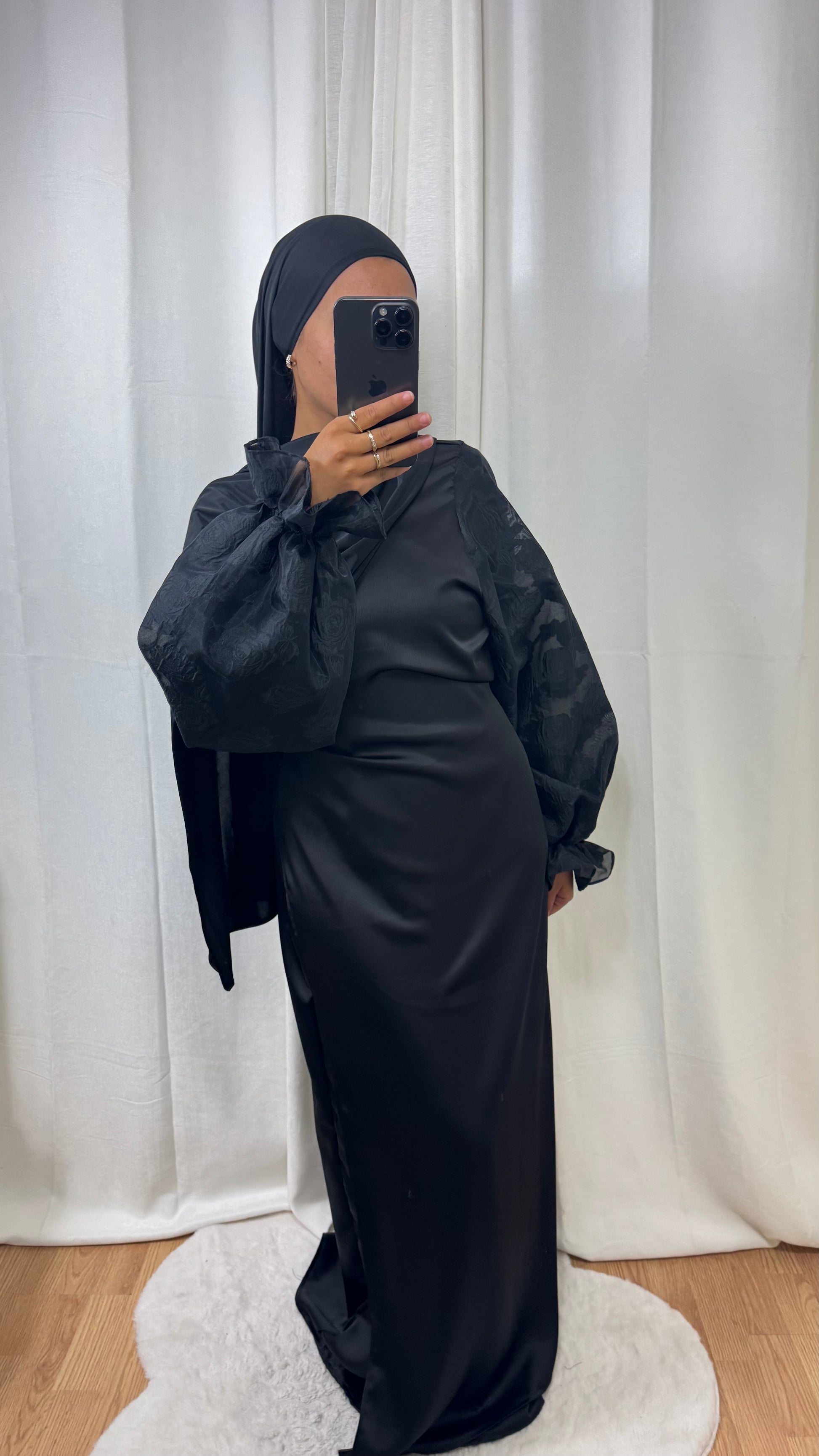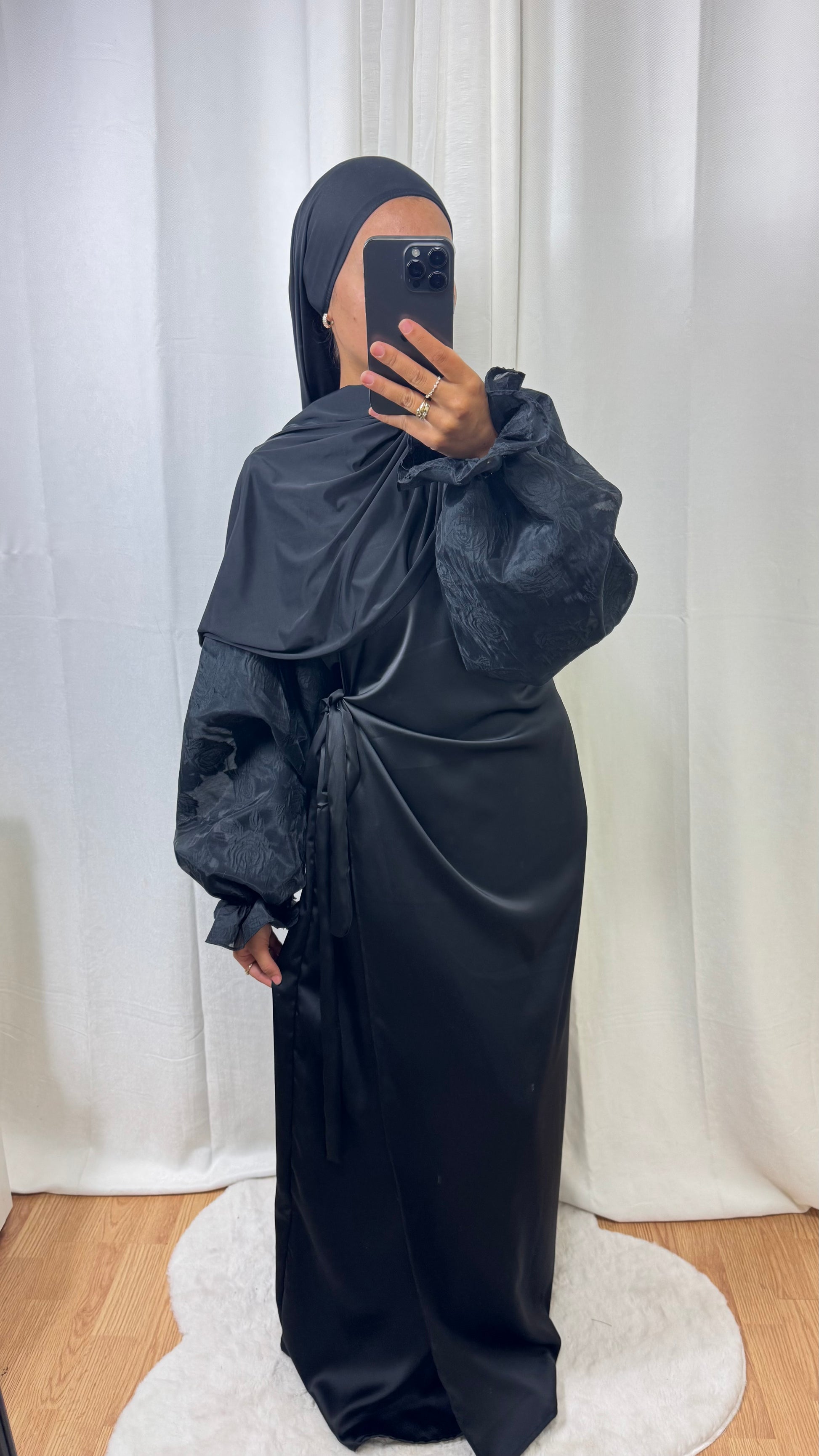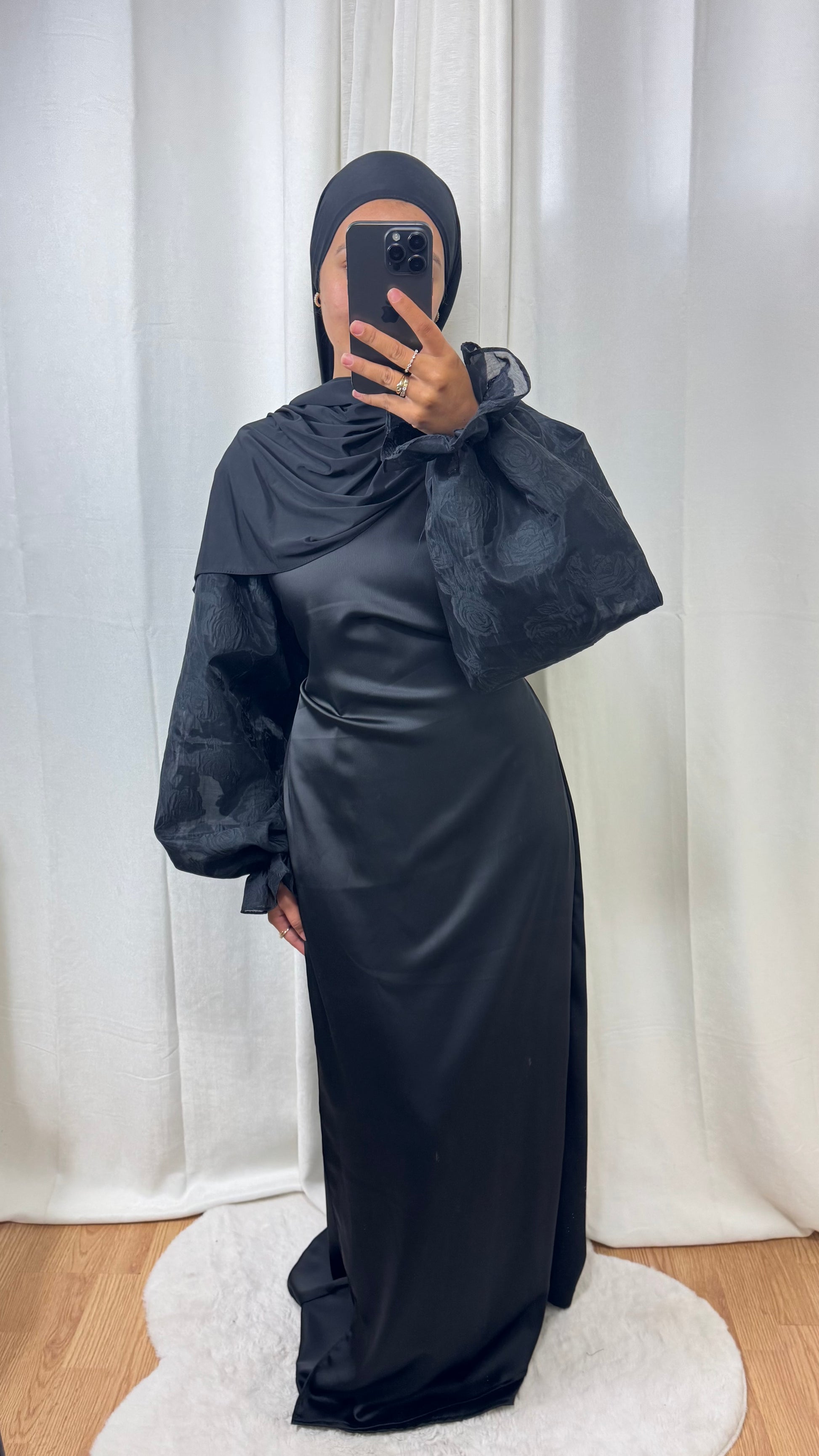 Les manches en organza brocart ajoutent une touche de luxe et d'originalité à cette pièce unique. Légères et aériennes, elles contrastent délicatement avec le tissu fluide de la robe, créant un jeu de textures subtil et élégant. Le design cache-cœur assure un ajustement parfait grâce à sa coupe soigneusement étudiée.