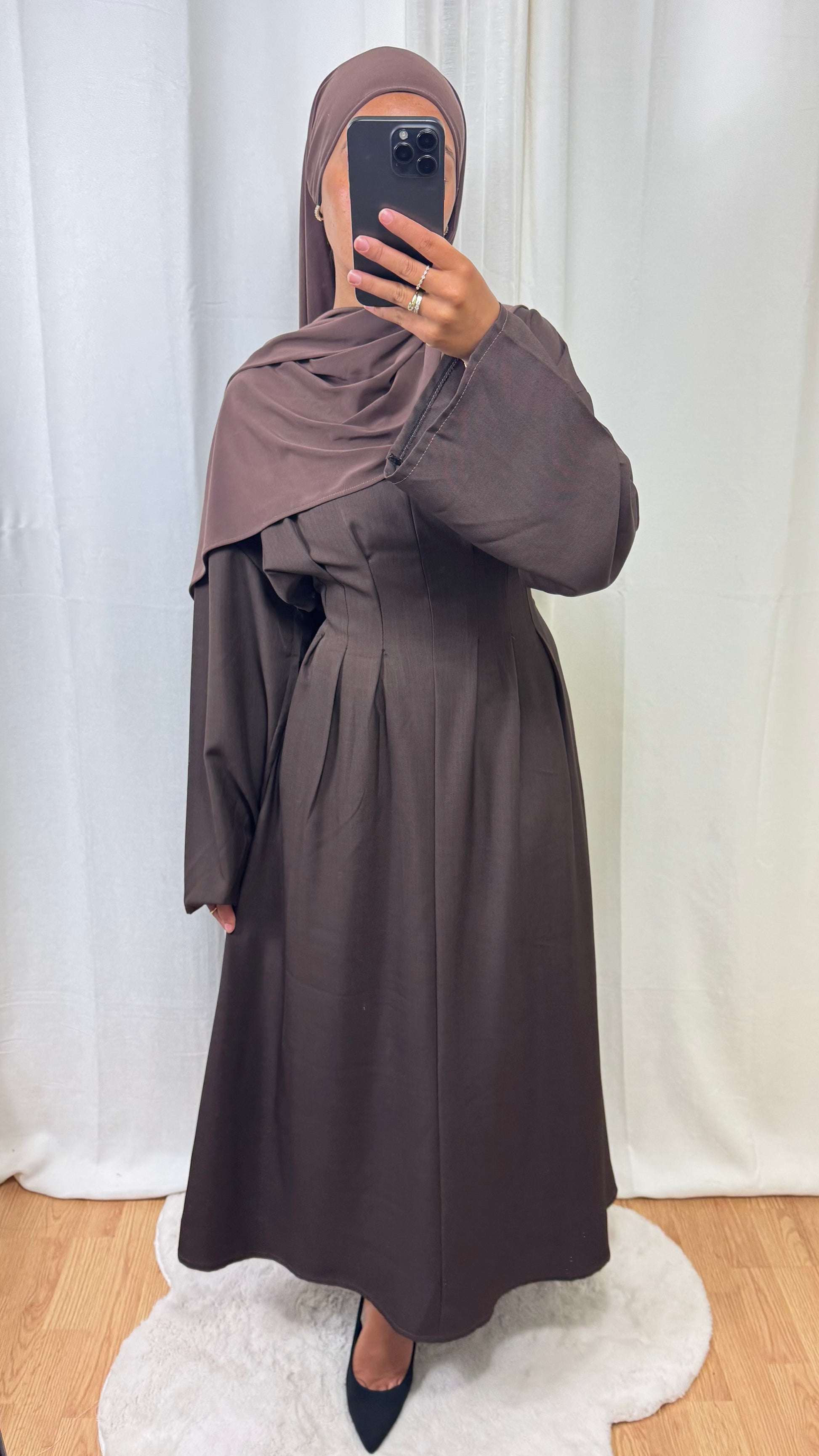 Coupe : longue et fluide, avec ses manches longues et ses plis délicats au bas de la robe qui offrent un tombé magnifique et raffiné.